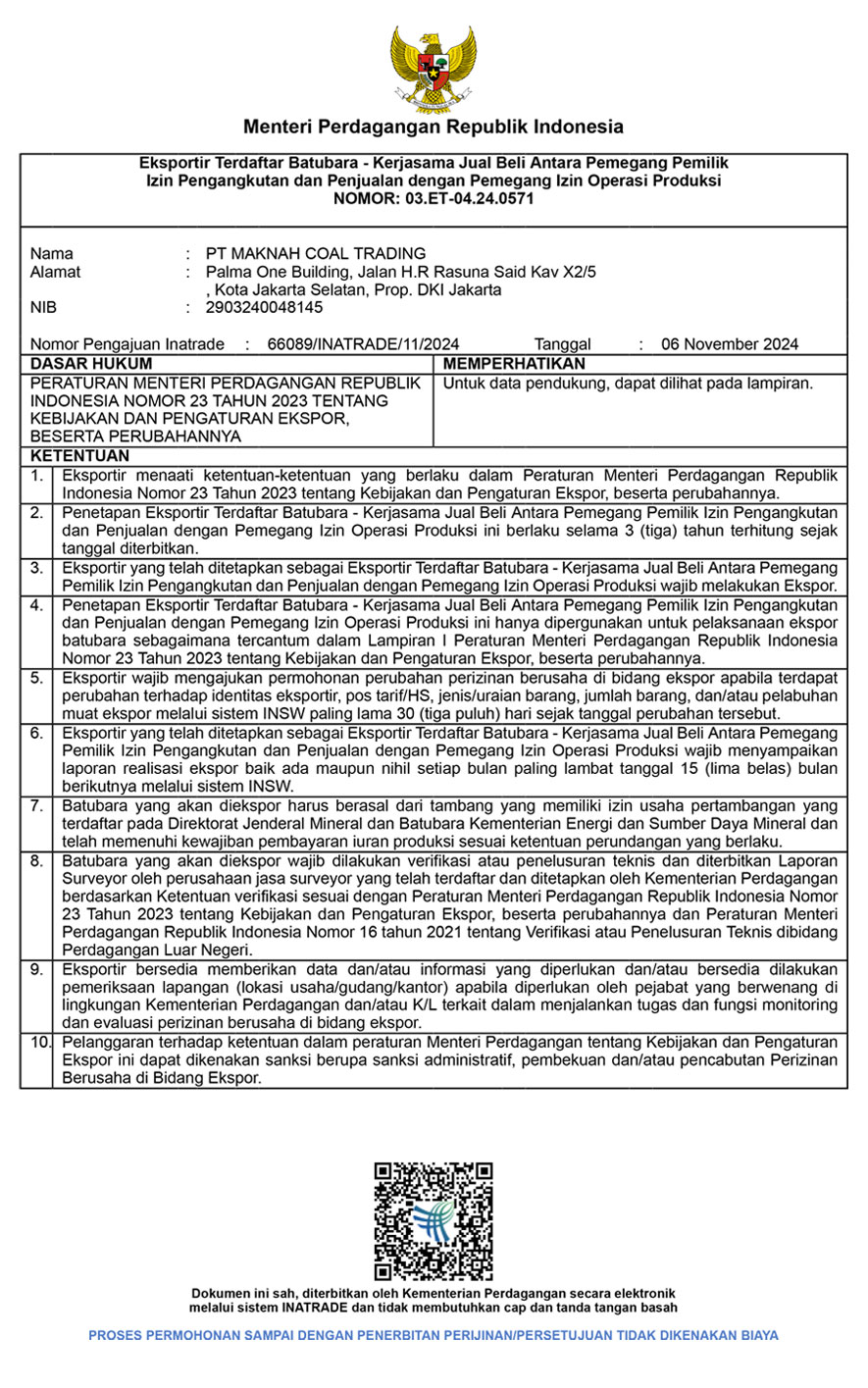 Our operations are fully compliant with all applicable local and international regulations. We hold all necessary licenses and permits to conduct business in the coal industry, ensuring that our activities meet the highest legal and safety standards.